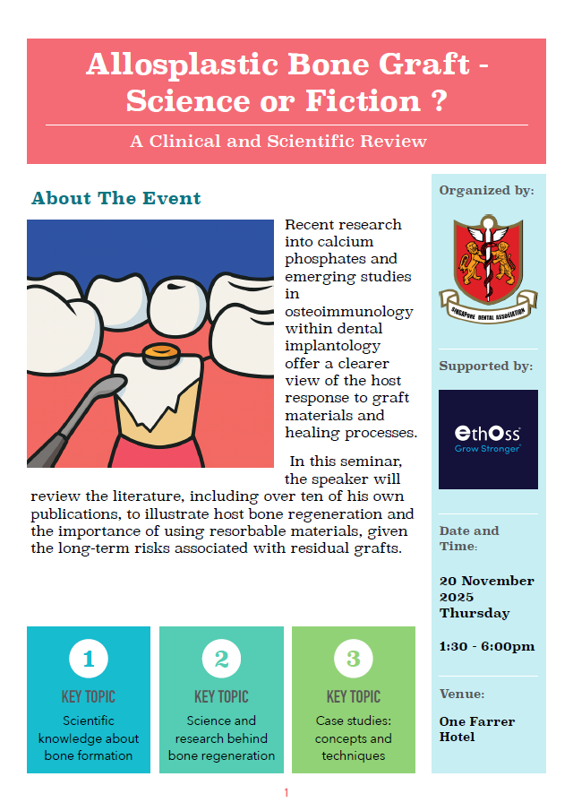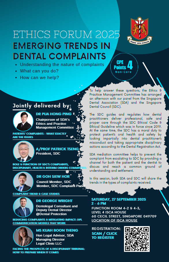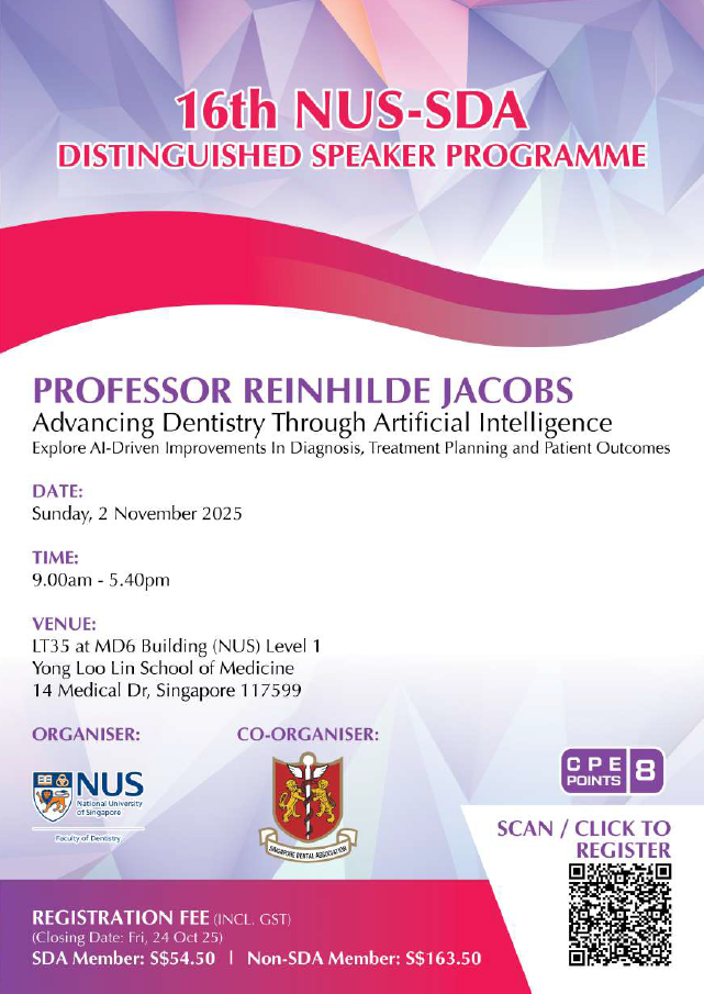 By registering for and attending this event, you acknowledge and agree that your image or likeness may be captured during the event, including any questions or comments you provide, and may be used for promotional purposes. Any personal information collected during the registration process will be used solely for organizing and communicating about this event. The views and opinions expressed by the speakers are their own and do not necessarily represent those of the Singapore Dental Association (SDA). Additionally, by registering, participants consent to receive information about future events or activities organized by the SDA.